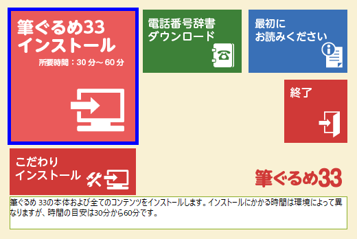 | 最小 | フォントは全て自動的にコピーされます。 素材(レイアウト、背景、イラスト)はコピーされません。 後から素材を使う場合は、もう一度インストール操作をして素材をコピーしてください。 ただし、「かんたん筆ぐるめ」用のレイアウトは自動的にコピーされます。 ※コピーするファイルは最も少ないので、インストール時間は早いです。 |