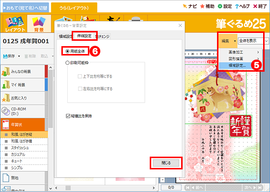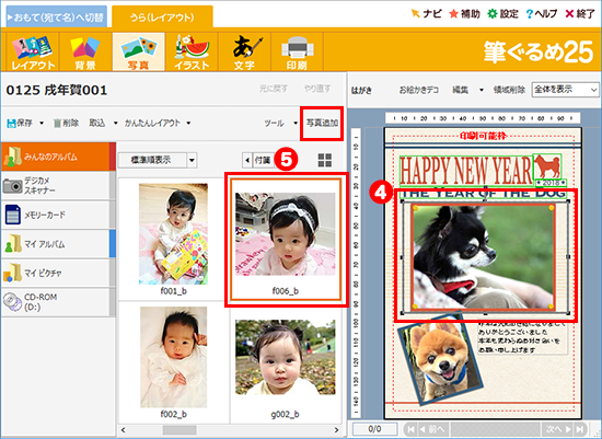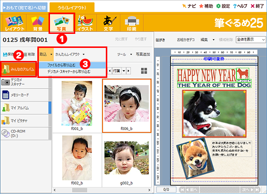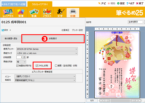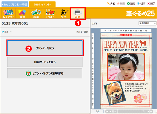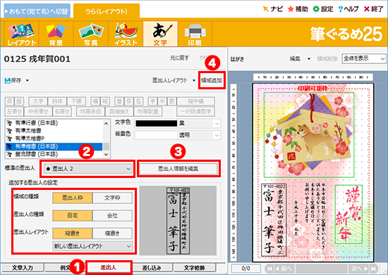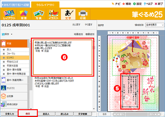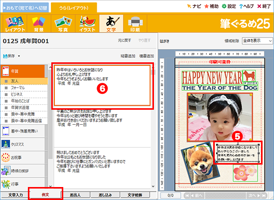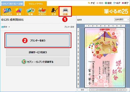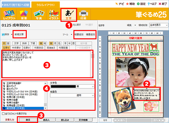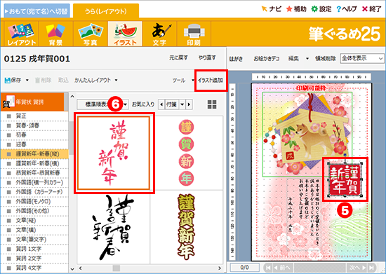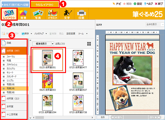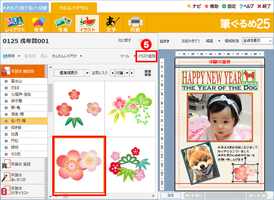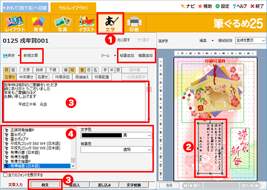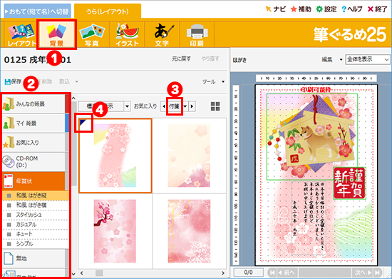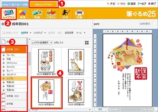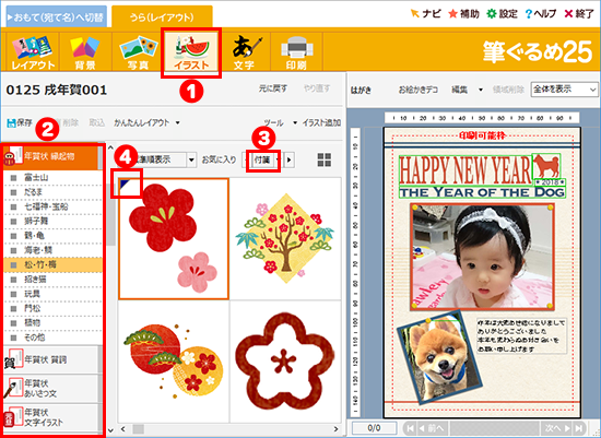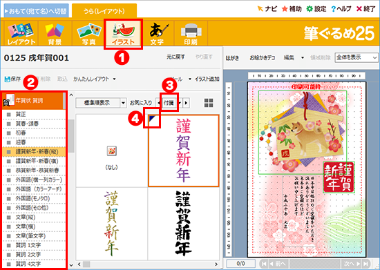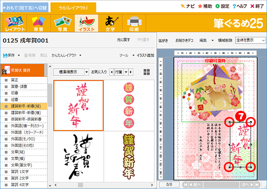 「筆ぐるめ 25」のサンプルレイアウトを元に背景やイラスト、あいさつ文などを変更する基本的な操作をご案内します。