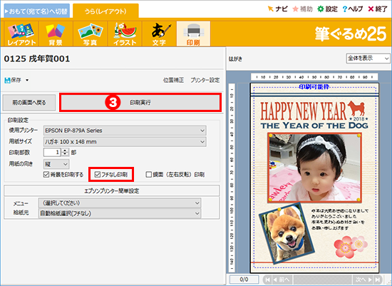 印刷のズレがあった場合に、印刷位置の補正を行うことができますし、用紙セットにミスがあった場合も往復はがきを無駄にするのを防ぐことができます。