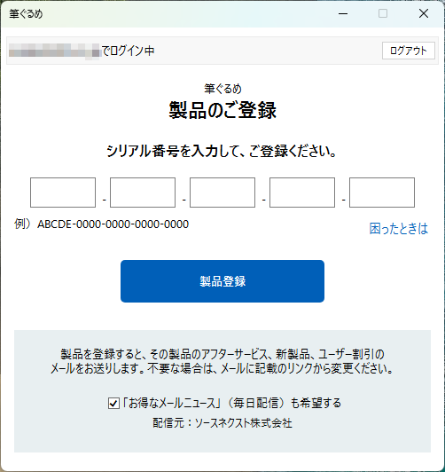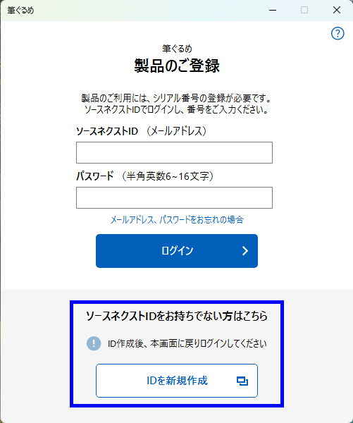 筆ぐるめ起動時にソースネクスト・アカウントのログイン画面が表示されます。