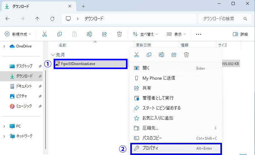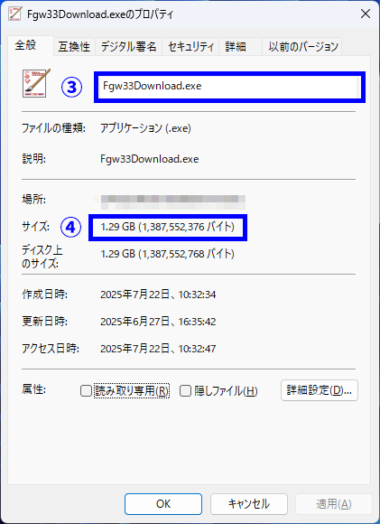 ダウンロードしたファイルを右クリック->プロパティでファイル名、ファイルサイズが下の製品情報と一致していることをご確認ください。