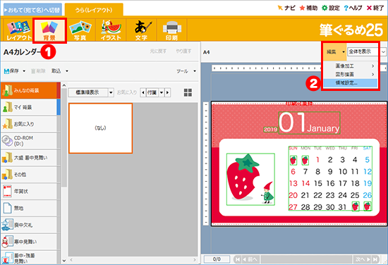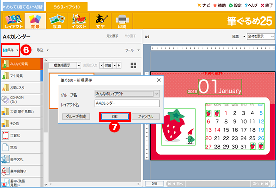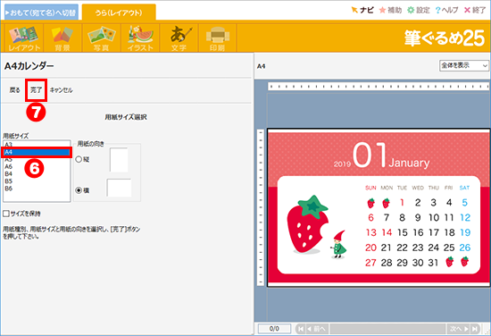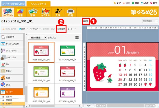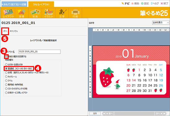 例えば、はがきサイズのレイアウトをA4用紙に印刷したい場合、筆ぐるめで用紙サイズをA4に変更してから印刷することができます。 ここでは、はがきサイズの「カレンダー」のレイアウトをA4サイズに変更する手順をご紹介します。
