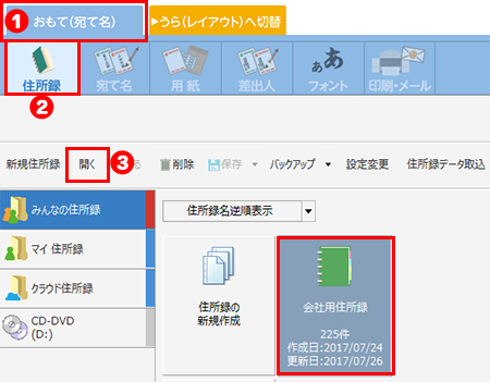 - ① 「おもて(宛て名)」タブをクリックしてください。