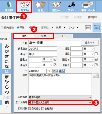 | 宛て名画面の「差出人指定」で、「会社③」を設定した場合 |